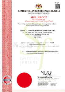 HACCP (Ministry of Health Malaysia) “HACCP certified — our production follows a globally recognized hazard-control system to prevent safety risks at every critical step.”